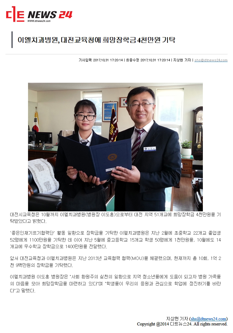 [µðÆ®´º½º24] ÀÌ¿¤Ä¡°úº´¿ø, ´ëÀü±³À°Ã»¿¡ Èñ¸ÁÀåÇÐ±Ý 4õ¸¸¿ø ±âŹ